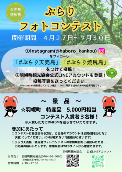 2.天売島・焼尻島で撮った写真とハッシュタグ「#ぶらり天売島」「#ぶらり焼尻島」をつけてInstagramに投稿!(どちらかだけでもOKです)