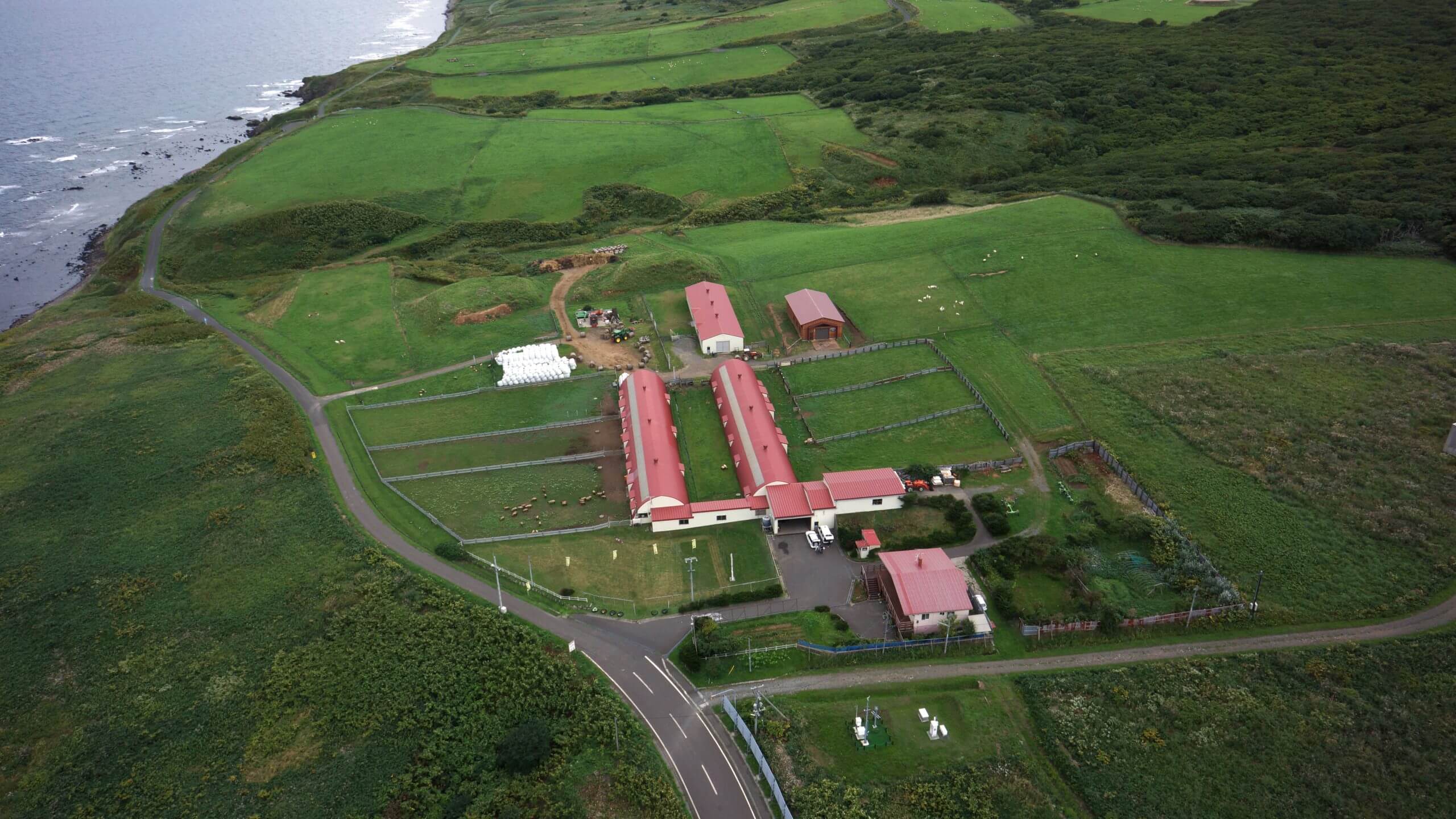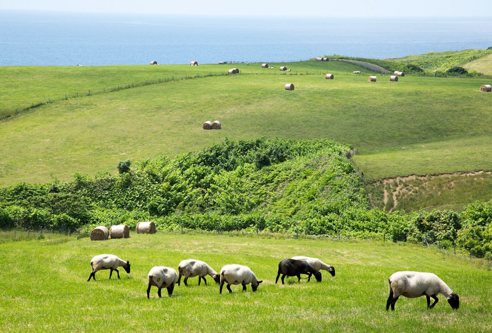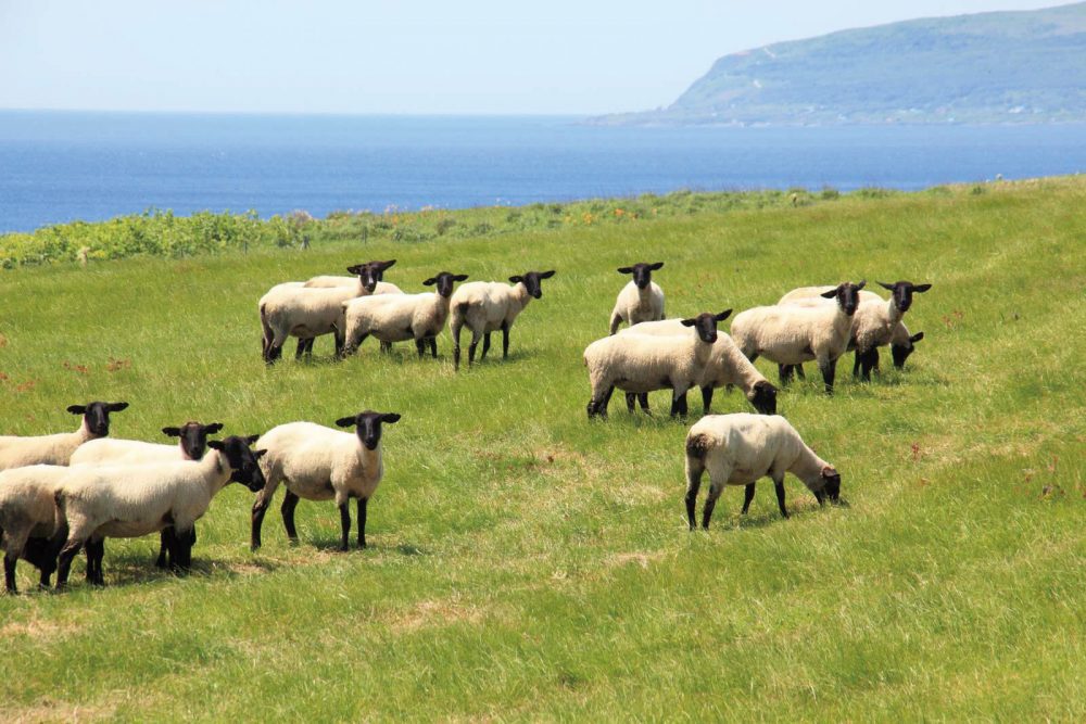 島の中央部に広がるスコットランドのような風景に、潮風を浴びながらのんびり草をはむサフォーク種の羊たち。